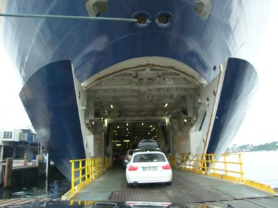Die Überfahrt war noch trocken, aber das Einladen und der komplette restliche Tag haben bei Dauerregen stattgefunden.